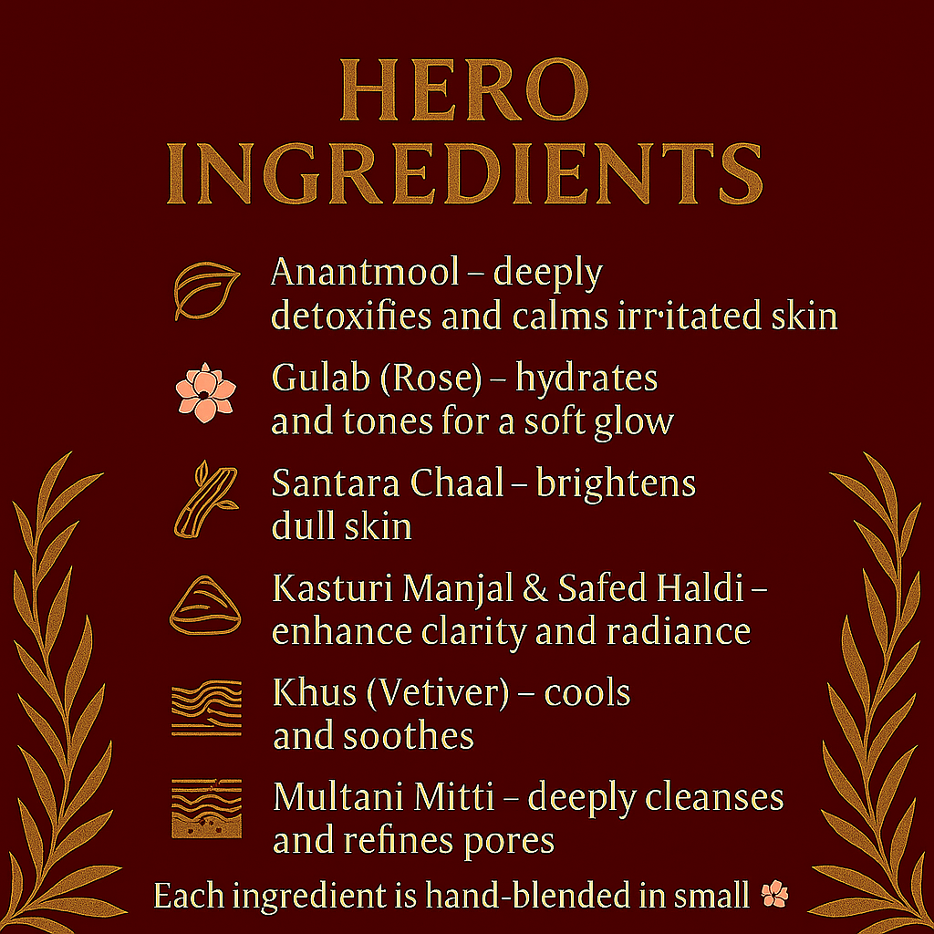 A potent Anantmool-led Ayurvedic blend that purifies deeply, clears stubborn tan, and smooths rough skin. Handcrafted in small batches with pure herbs and oils to deliver bright, refined, naturally glowing skin — with 0% chemicals or preservatives.