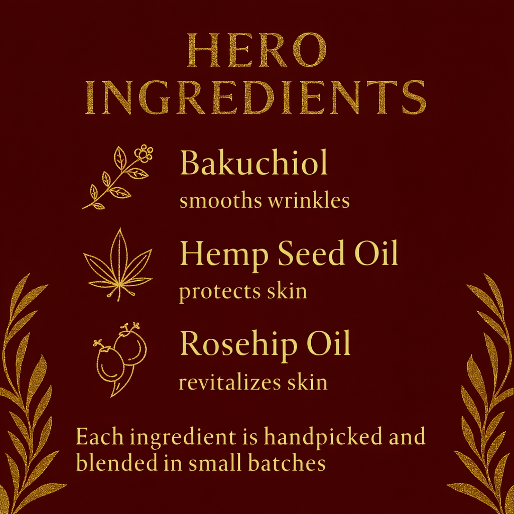 A gentle Bakuchiol-led Ayurvedic blend that renews deeply, fades pigmentation, and smooths early signs of ageing. Handcrafted in small batches with pure botanicals and oils to deliver firmer, brighter, naturally radiant skin.
