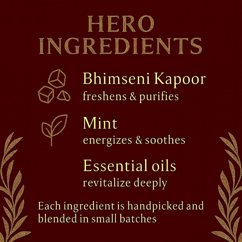 A potent Bhimseni Kapoor–led Ayurvedic blend that cleanses deeply, clears impurities, and refreshes the skin with a natural cooling lift. Handcrafted in small batches with pure herbs and essential oils to deliver cleaner, calmer, naturally invigorated skin.