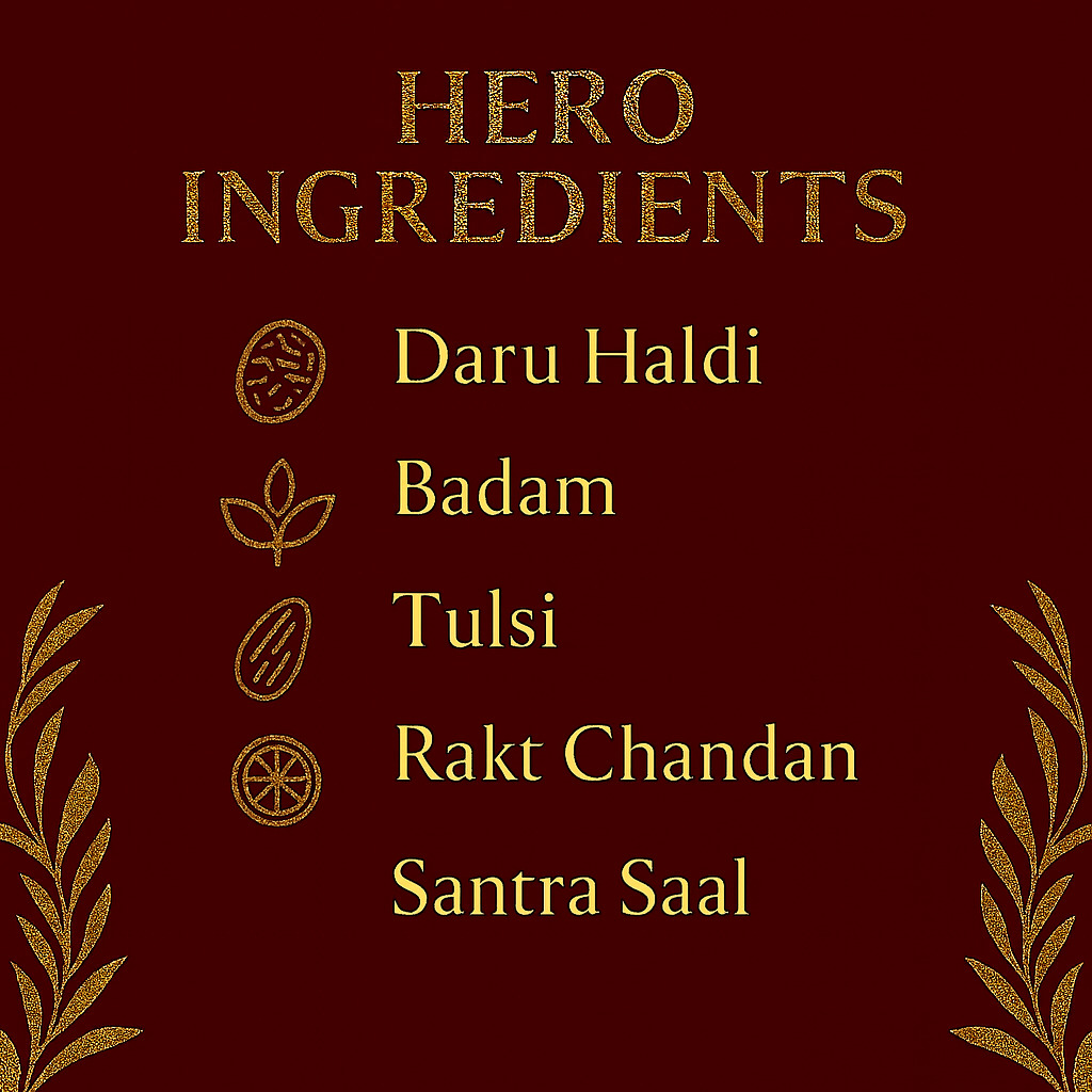 A potent Anantmool-led Ayurvedic blend that purifies deeply, clears stubborn tan, and smooths rough skin. Handcrafted in small batches with pure herbs and oils to deliver bright, refined, naturally glowing skin — with 0% chemicals or preservatives.