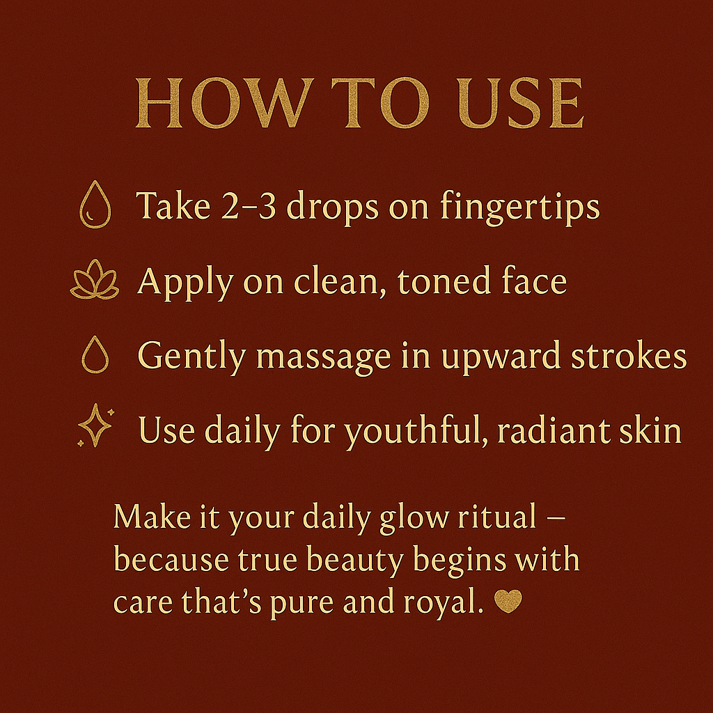 Apply 2–3 drops on clean skin, gently pressing it in. Best used at night.