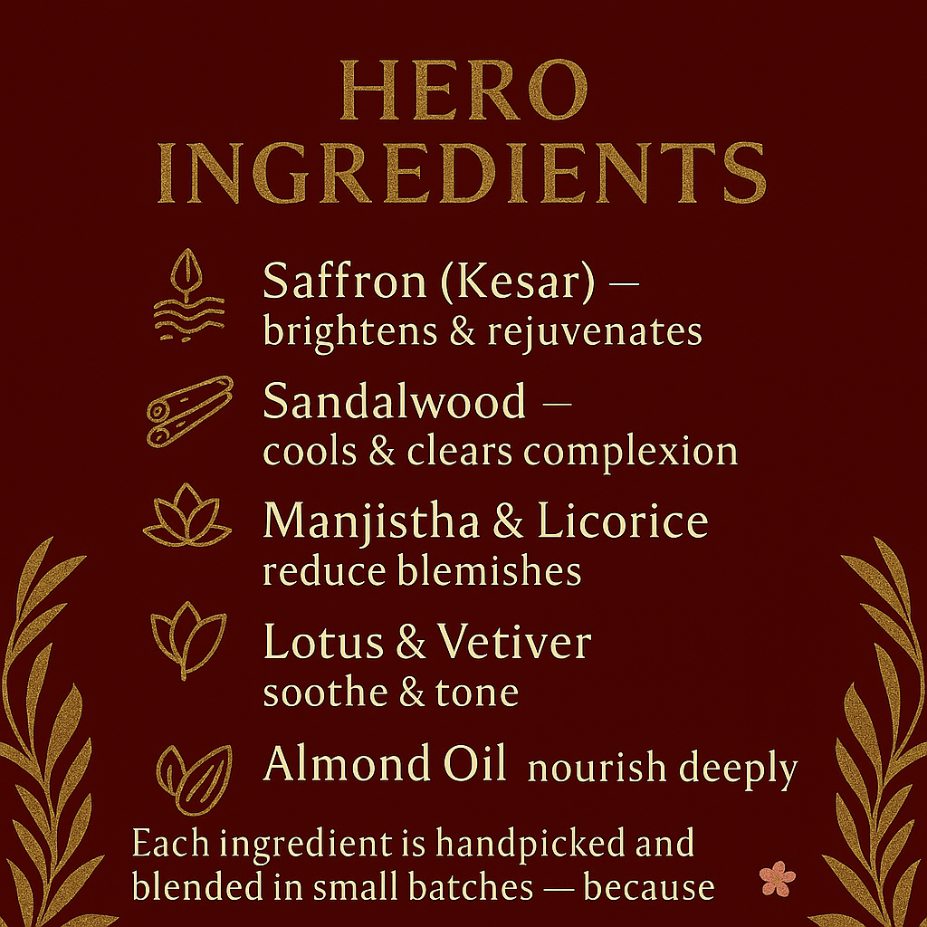 A soothing Chandan–Mulethi Ayurvedic blend that cleanses deeply, reduces dullness, and evens tone without drying the skin. Handcrafted in small batches with pure herbs and fine powders to deliver smoother, clearer, naturally glowing skin .